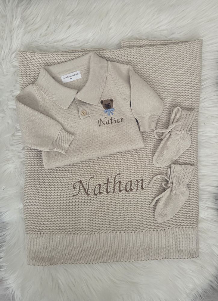 Name is embroidered on romper and blanket