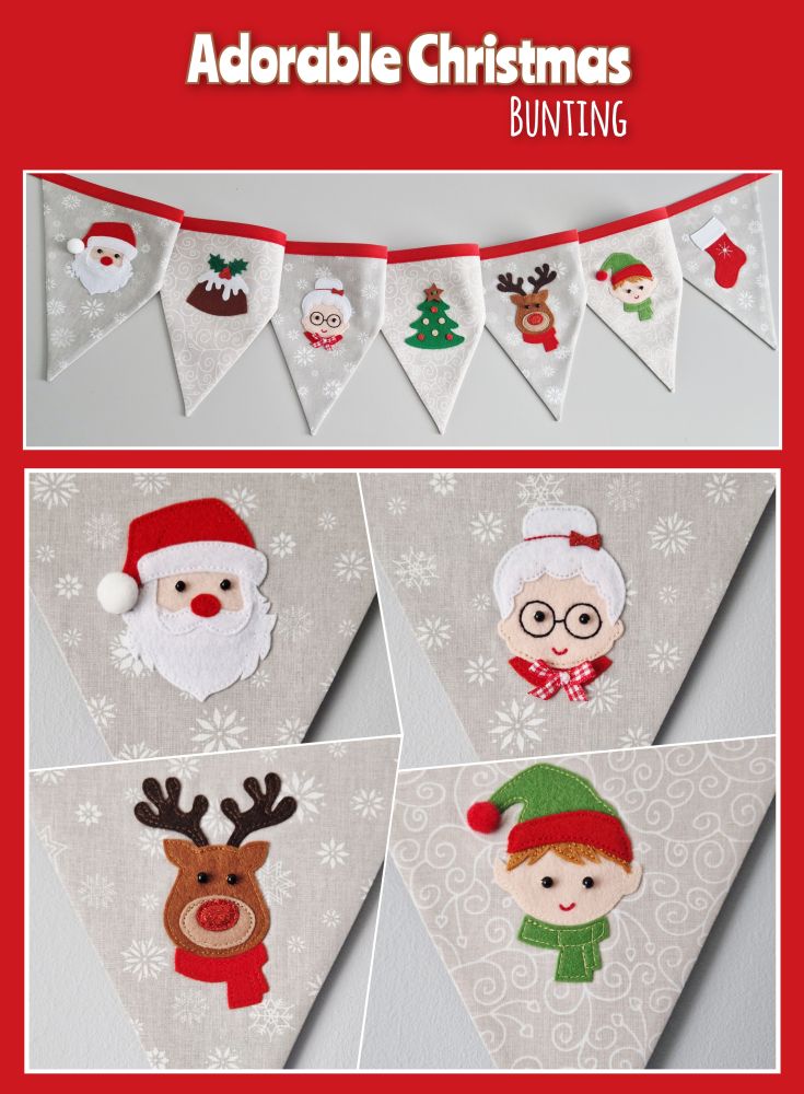 Get your home holiday-ready with this charming handmade Christmas bunting! Each pennant features a delightful festive character — from Santa and Mrs. Claus to a jolly reindeer, cheerful elf, Christmas pudding, tree, and stocking.