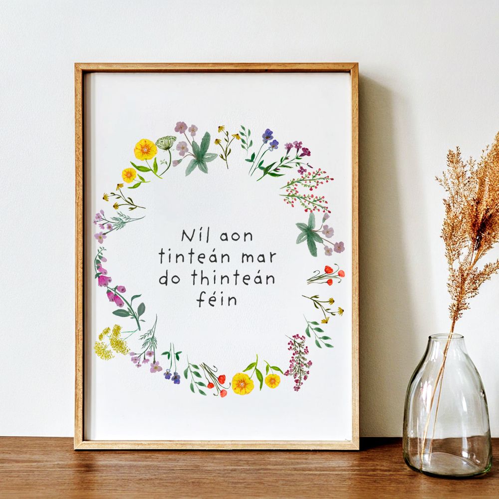Bring a little piece of Ireland into your home with this beautifully hand-painted print, features native Irish wildflowers and Irish (Gaeilge) text meaning 'There is no Place like Home' perfect for Gaeilgeoirí, or anyone with a grá for Ireland’s flora. It will make a perfect gift for to grace any home abroad or closer to home.🌸🌺🌻