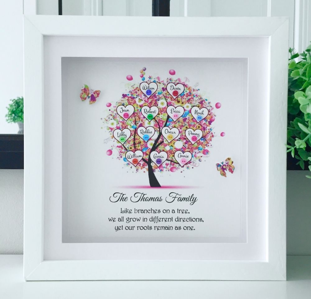 A framed personalised Family Tree capturing the family names on a little love heart.This framed print is the ideal gift for Birthdays, New Home, Anniversaries, Christmas or just beacuse :-) As all our frames are made to order, wording can change to suit within reason. Just ask us, we are always here to help. Please let us know if your order is urgent.