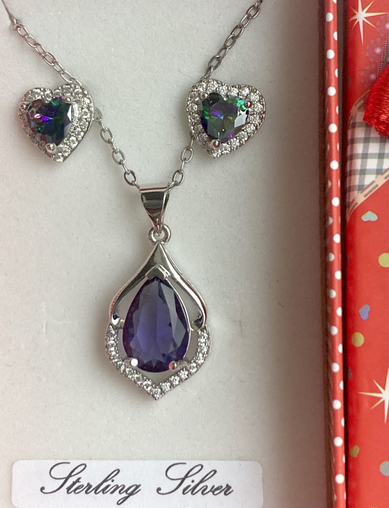 Beautiful Amethyst 925 sterling silver pendant surrounded by diamonds on a silver chain with dazzling heart earrings in a red bow gift box.Amethyst representing tranquility & calm is a beautiful crystal.This is a lovely gift idea for any special occasions ✨ 💜