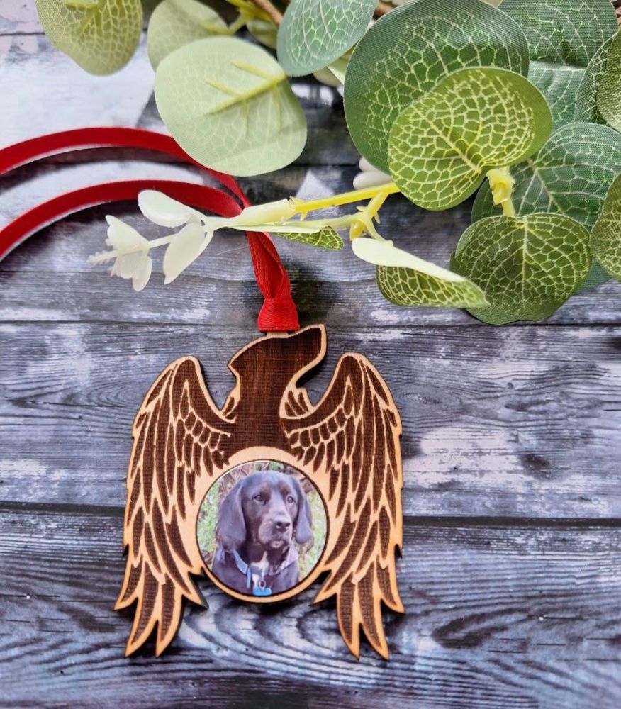 Beautiful wooden Angel personalised with your cat or dogs photo. Adorned with red ribbon packed in a pretty velvet bag.