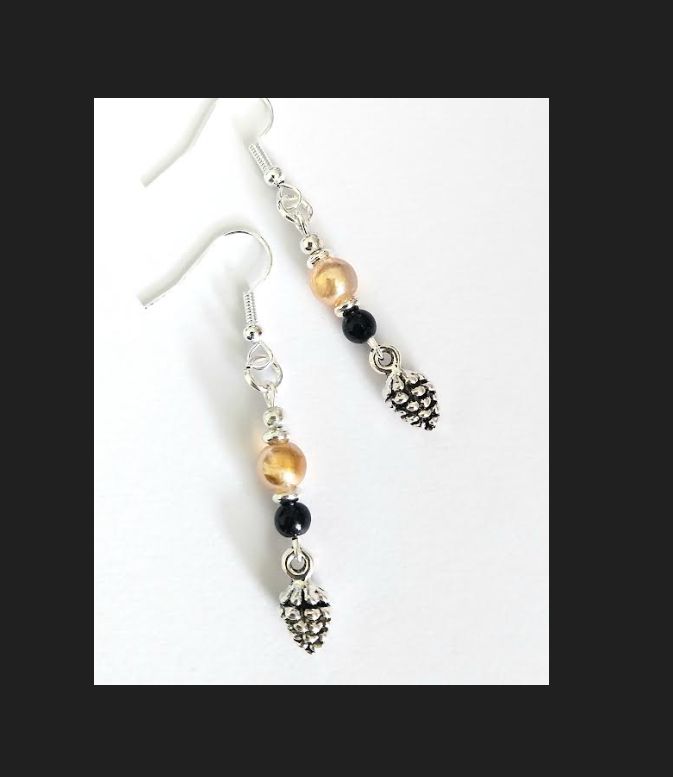 Handmade earrings, created with cute antique silver pine cones, silver plated beads, small black acrylic beads and gorgeous irididescent glass beads in a light apricot colour. They are suspended from silver plated, nickel free ear wires, suitable for sensitive ears. Beautiful, lightweight and comfortable to wear… Elevate your look with these lovely bespoke pieces… They arrive in a pretty organza bag, and have free shipping!
