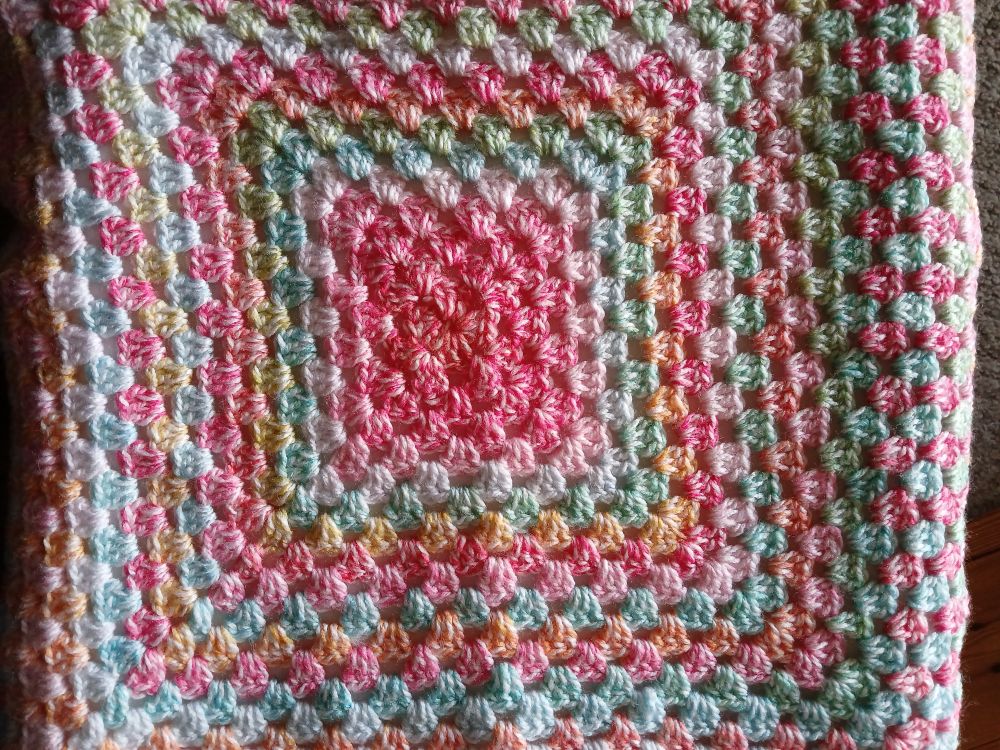 Unique baby gift, granny square style pram blanket in rainbow colours.