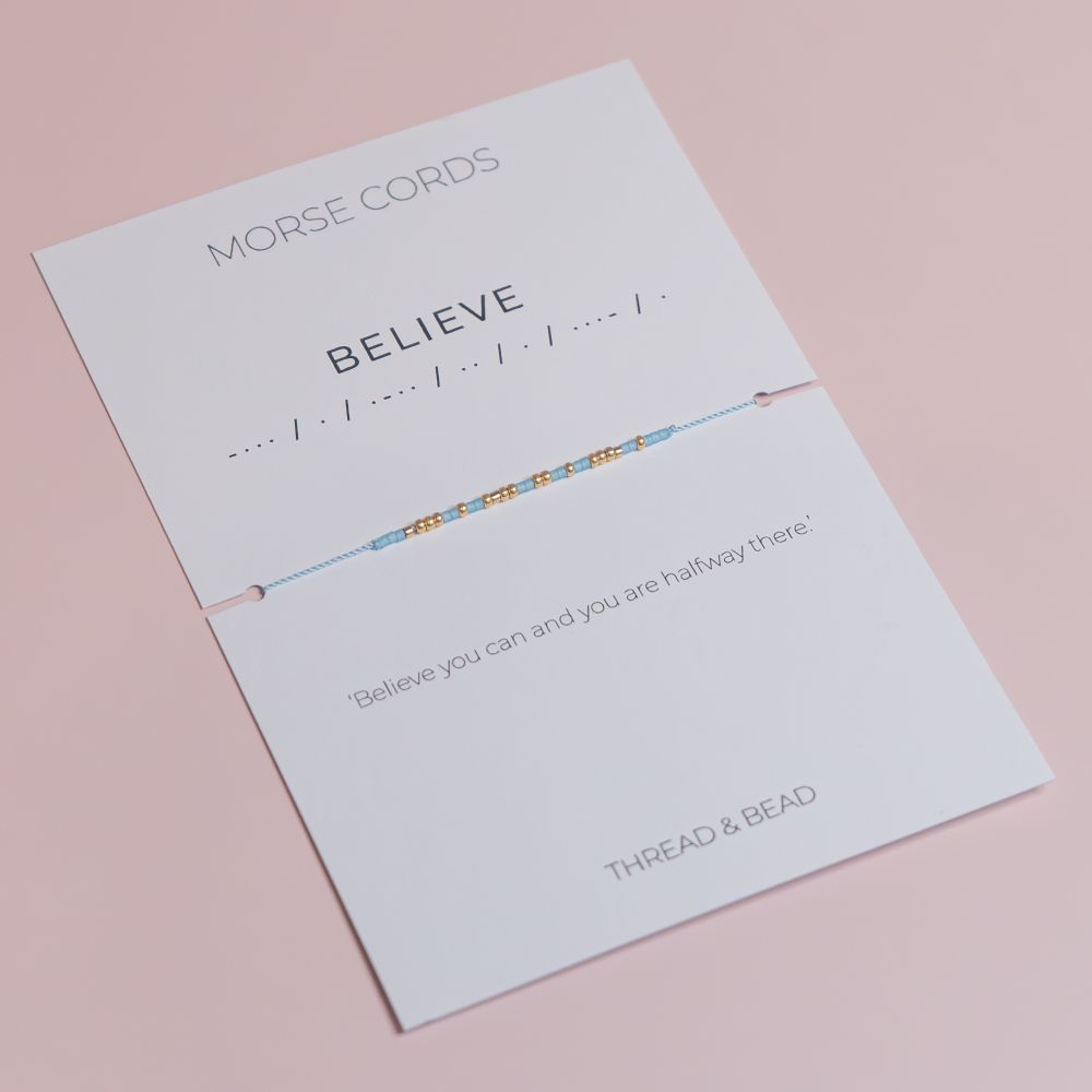 This Morse Cord bracelet hides a secret message: BELIEVE, spelled with a mix of 24k gold-plated Miyuki beads and glass Miyuki beads, all hand-threaded onto durable thread that’s ready for everyday wear.