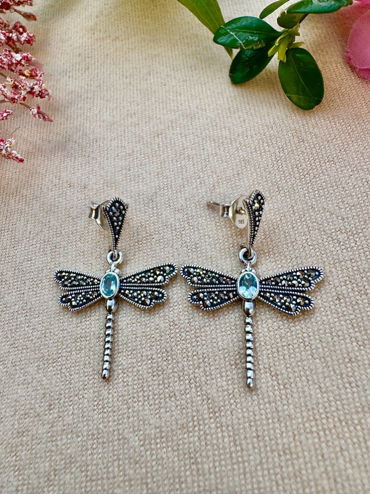 Blue topaz Sterling Silver Marcasite Dragonfly Earrings