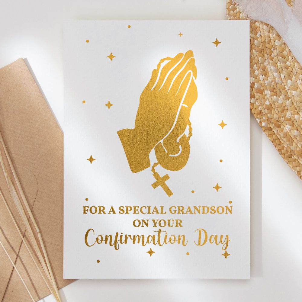 Celebrate these special milestones with our beautiful card featuring stunning gold foil praying hands with rosary beads and cross, handmade in Ireland with premium materials.