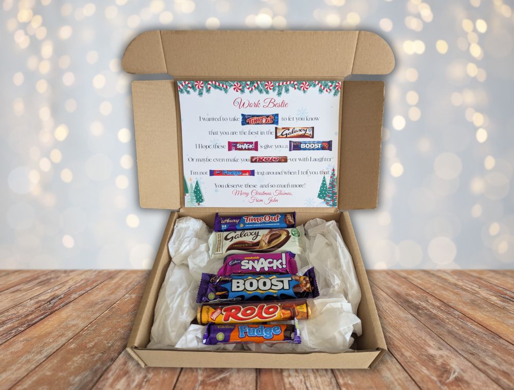 Introducing our Work Bestie Christmas Chocolate Poem Gift Box! Packed with six delicious full-sized chocolate bars, it’s the perfect way to spread holiday cheer.