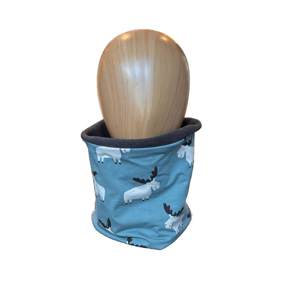 Toddler fleece lined snood. Organic Cotton Jersey outer with Moose pattern in cream and grey on Sage Green background
