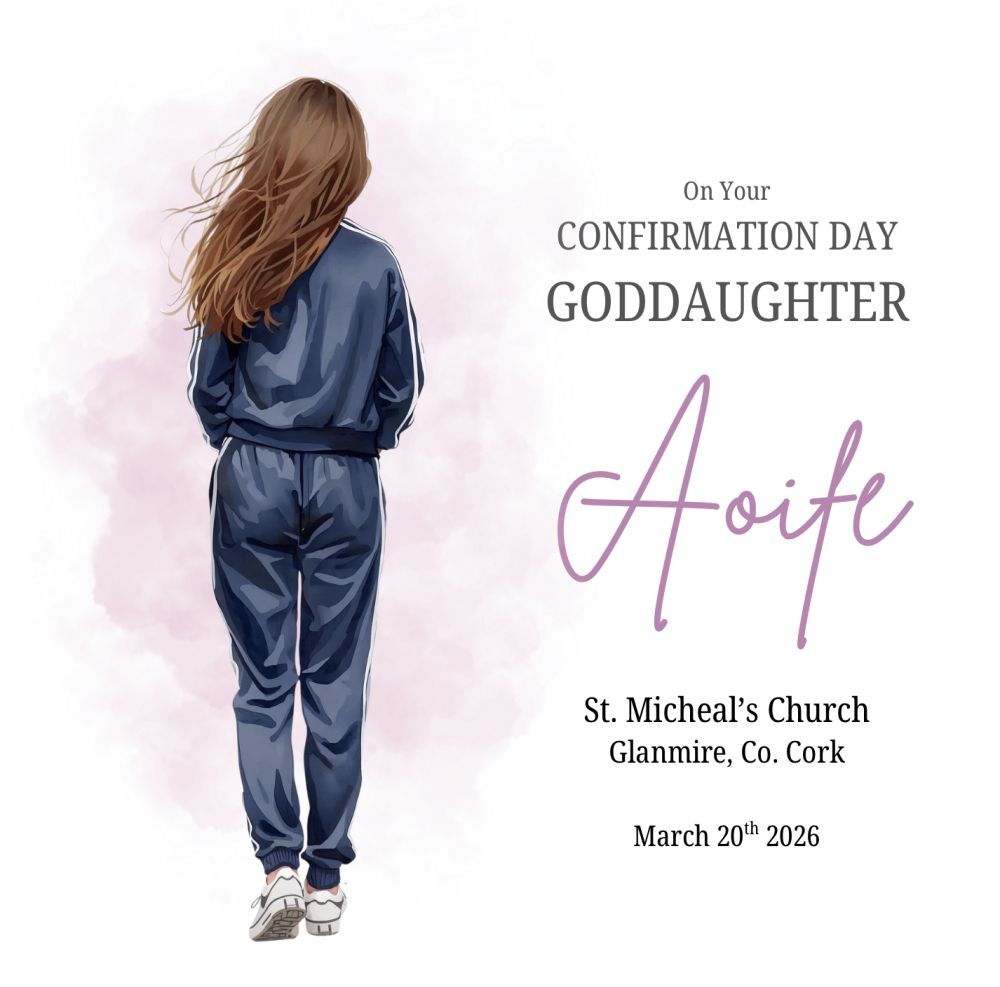 Celebrate her special Confirmation day with a card that truly reflects her personality. This unique personalised Confirmation card features a girl dressed in a stylish navy tracksuit and can be customised with your choice of hair colour — brown, blonde, black, or red — to create a meaningful keepsake she’ll treasure.
