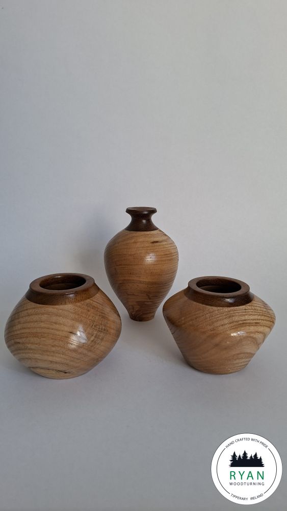 Set of three decorative Irish Ash vessels with Iroko wood rim