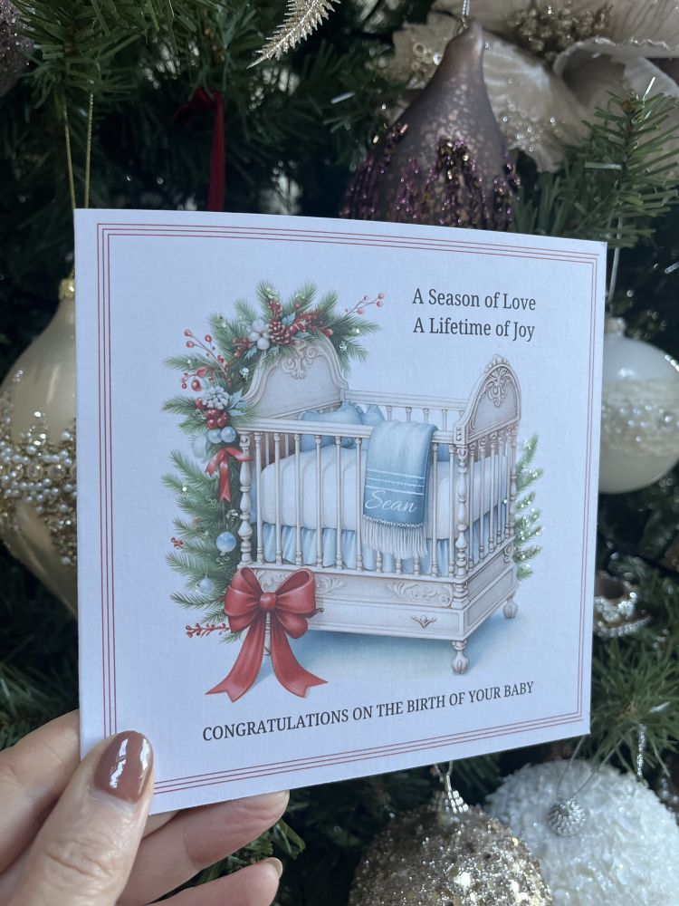 This enchanting 6x6" card is printed on luxurious linen-textured cardstock, featuring a serene crib scene surrounded by glittering Christmas trees, symbolising warmth, love, and the magic of new beginnings. Nestled inside the crib is a personalised blanket featuring your baby’s name, making each card a unique and heartfelt keepsake.