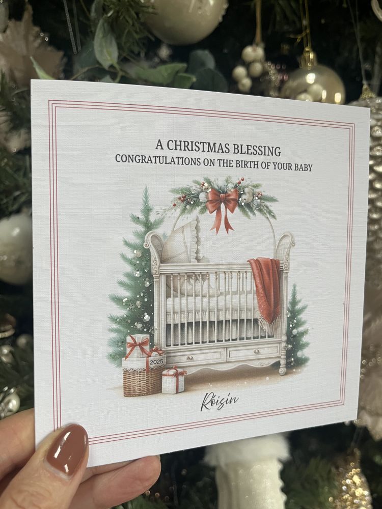 This enchanting 6x6" card is printed on luxurious linen-textured cardstock, featuring a serene crib scene surrounded by glittering Christmas trees, symbolising warmth, peace, and love. Nestled inside the crib is a personalised blanket bearing your baby’s name, creating a truly unique and heartfelt touch.