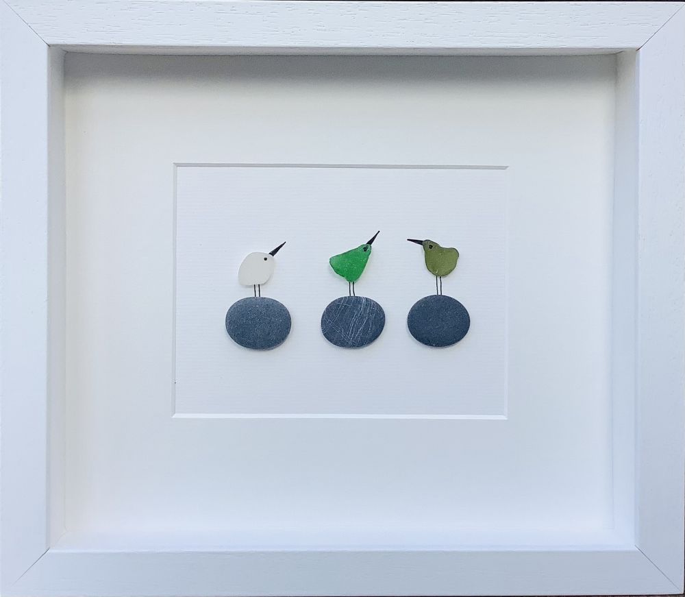 Three little birds sea glass art! Sea glass was hand picked  from the beaches and rocks of Sandycove Co Dublin. Each piece is unique and handmade locally. Frames with glass fronts panel are sourced from Wicklow. Free postage in Ireland . Give a sustainable handmade Irish gift!