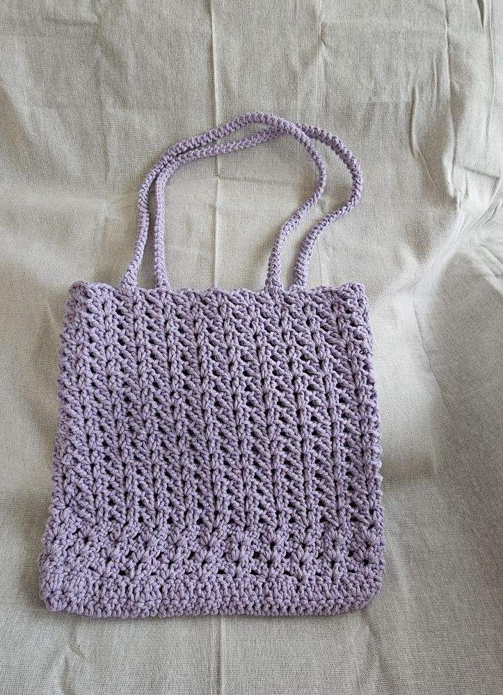 Hand crocheted tote handbags bag in light violet colour.