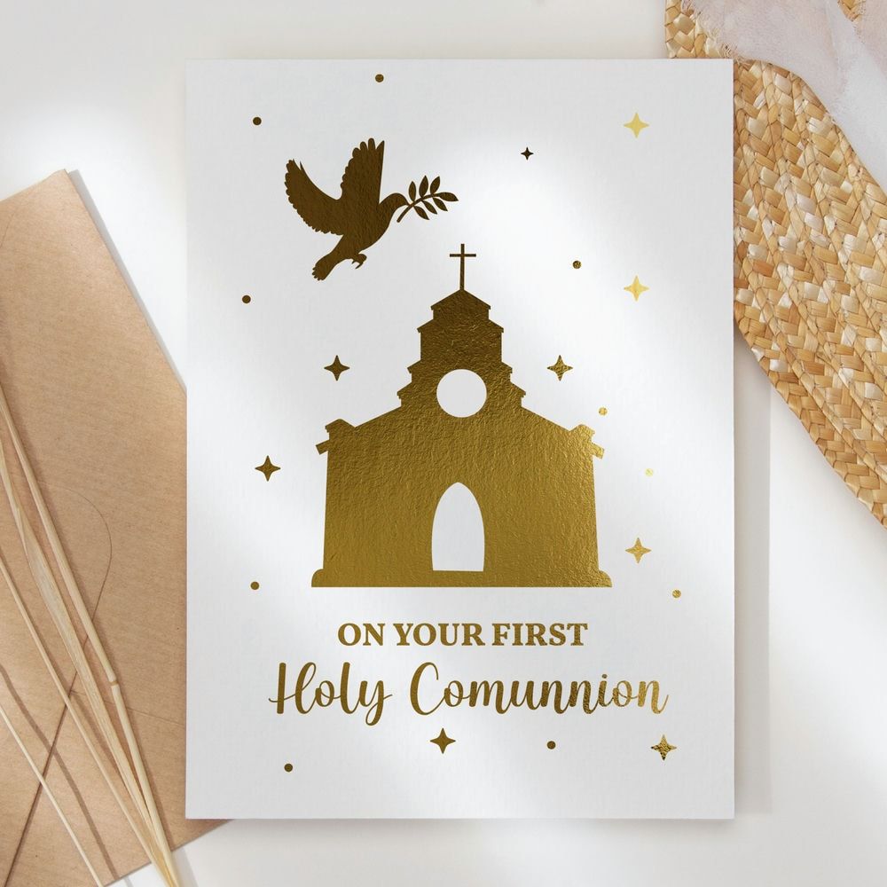 Celebrate this sacred milestone with our stunning First Holy Communion card, featuring beautiful foil detailing that catches the light.