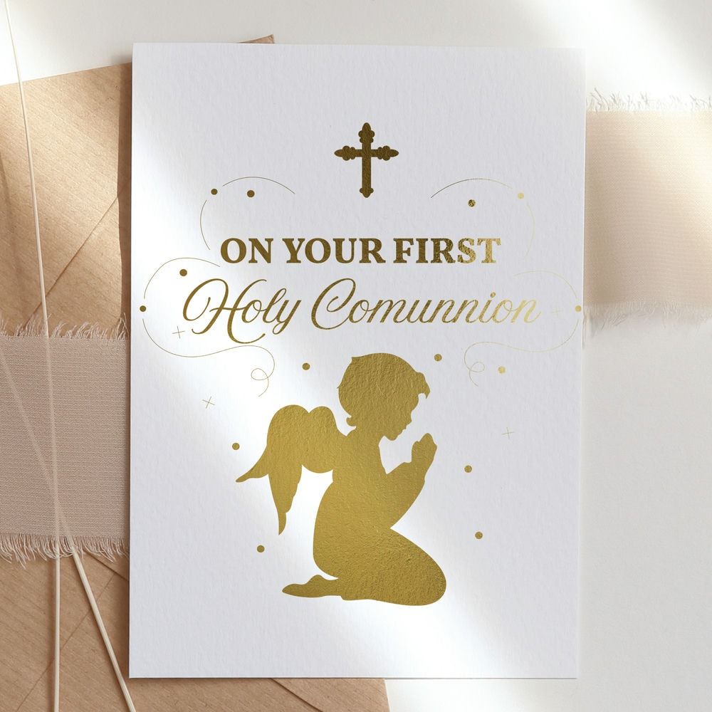 Celebrate this sacred milestone with our stunning First Holy Communion card, featuring a beautiful praying child silhouette with celestial foil detailing that catches the light.