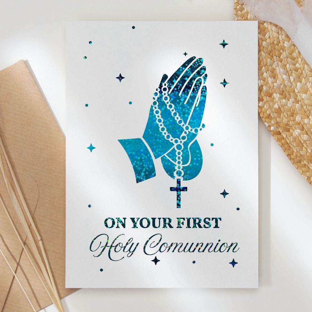 Celebrate this sacred milestone with our stunning First Holy Communion card, featuring beautiful praying hands with rosary beads in exquisite foil detailing that catches the light.