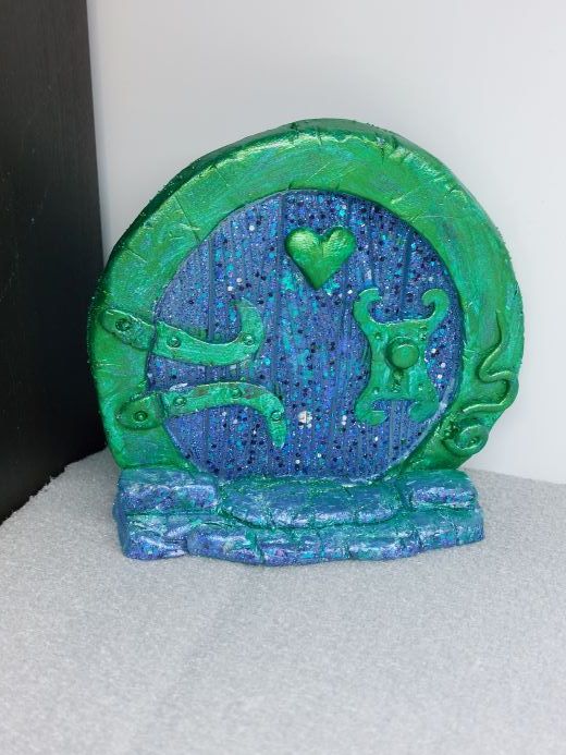 Green and Glitter Blue - M Fairy Door with Heart - 9.5cm - Ready 2 Go & Custom Made - Ornaments 4 Outdoors Magic Pixy Dust Fairy Villa Enchanted Forest Wood Wicca Fae Wings