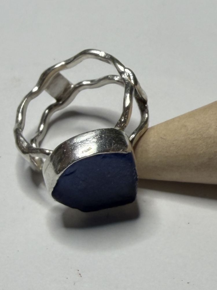 Handmade sterling silver wave ring with blue sea glass. Size O