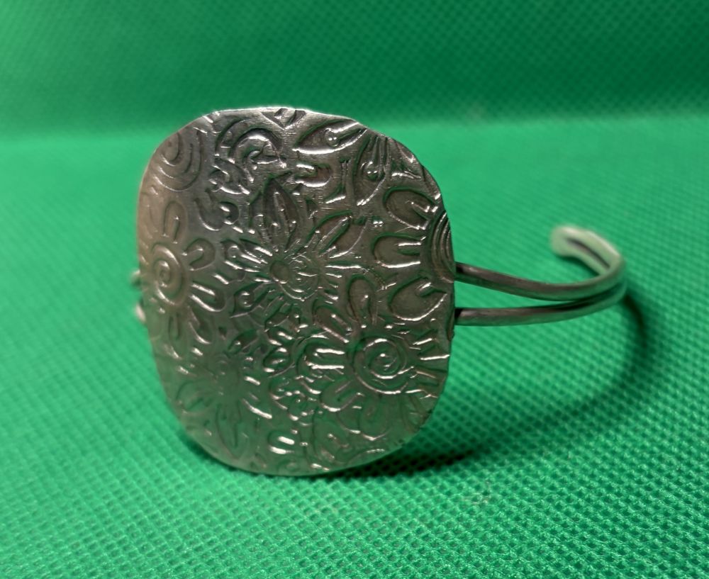Hand made silver flower pattern cuff bracelet. Measures 140mm/14cm
