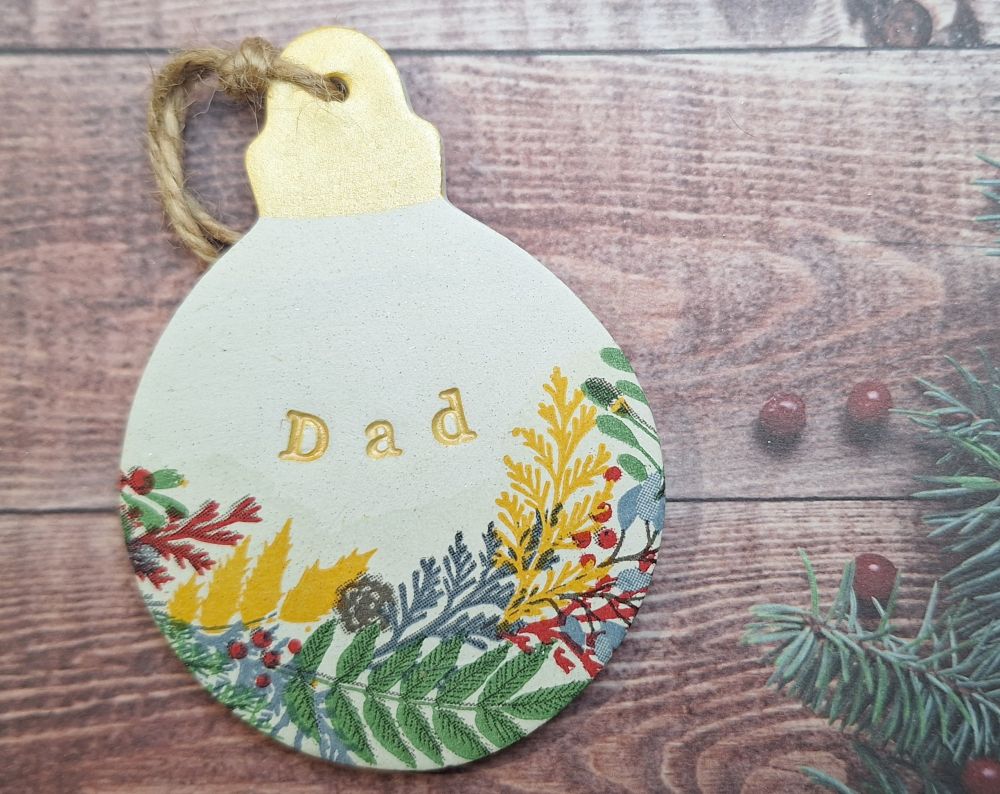 Handmade Christmas clay tree ornament. Personalised decoupage bauble, perfect for festive decorations or unique seasonal gifts. Customisable with names to make your Christmas tree truly special. Ideal for home decor, gifts for loved ones, and keepsakes that last for years.