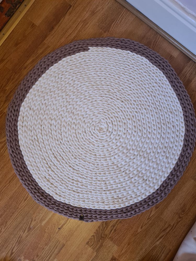 Handcrafted circular crochet rug — the perfect addition to a child’s bedroom or nursery. Also works well in a living room area.