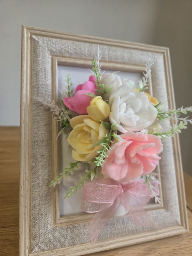 Handmade scented soap flowers in a photo frame
