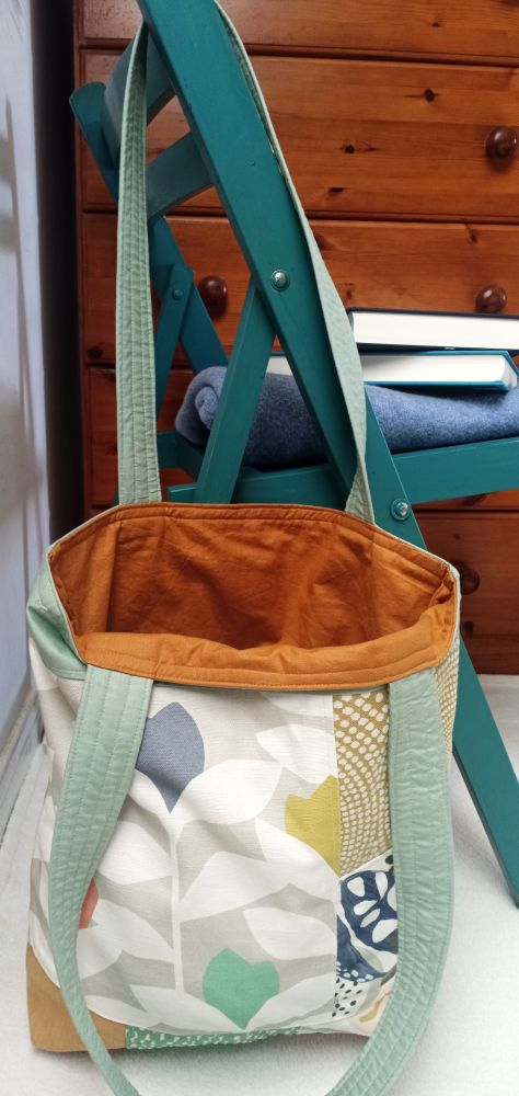 Handmade tote bag. Beautiful assortment of fabrics , patchworked together , with sage green handles. Fully lined with a mustard yellow fabric.. Lovingly handmade , both sides different & completely unique. Ideal gift for birthdays, retirement, thank you or just because. Approx size 16 x 15