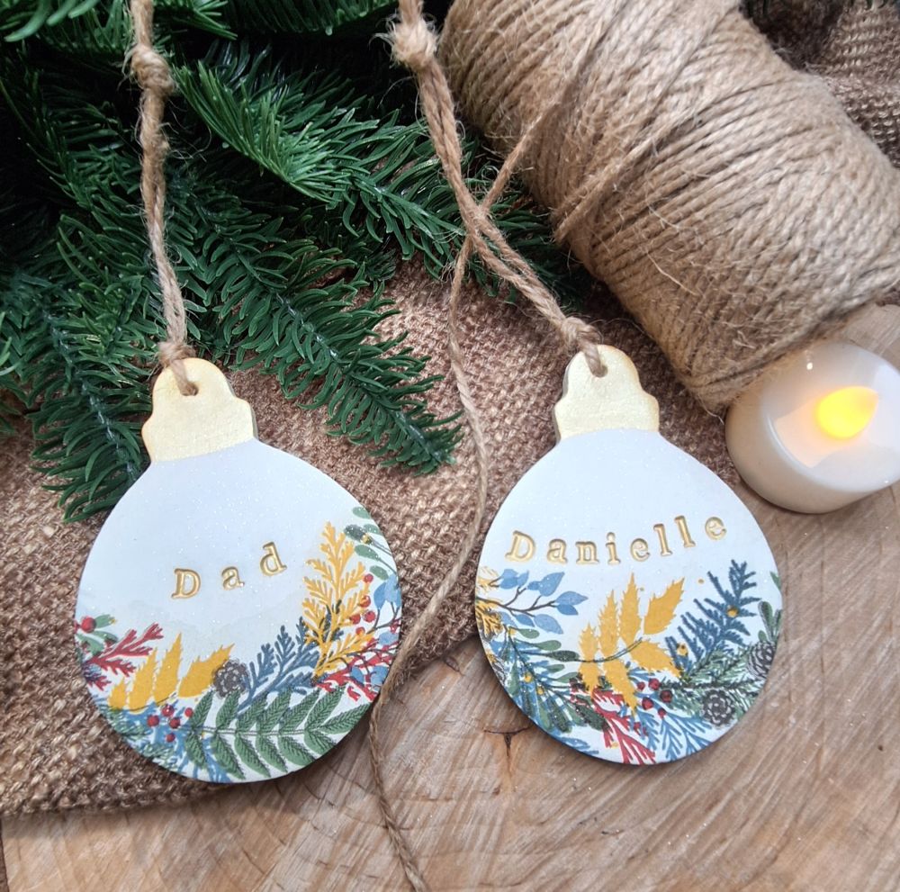 Handmade personalised clay tree decoration, Christmas bauble decoupaged Irish made