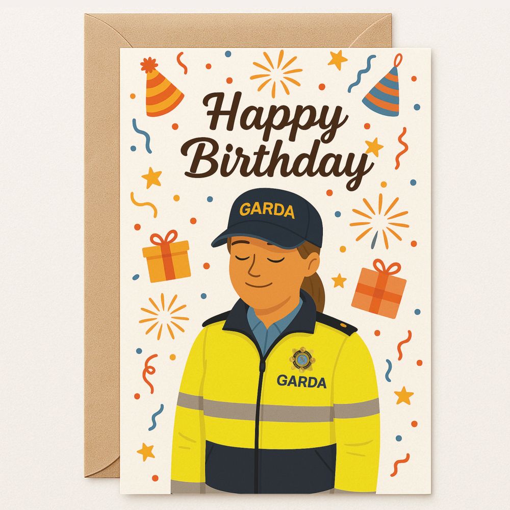 Celebrate someone amazing with this bright and joyful Garda-themed birthday card. Featuring a smiling Garda Síochána officer surrounded by festive icons, this card is a heartfelt way to honour Ireland’s everyday heroes.