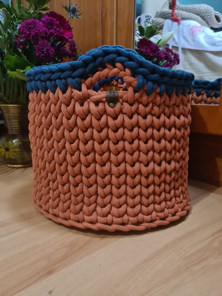 The rich rust orange body is beautifully contrasted by a bold deep teal/blue braided rim and sturdy handles. Made using thick, soft cotton cord in a tight, durable chunky knit stitch — this basket is built to last and holds its shape beautifully. The weighted base keeps it stable, while the generous size and built-in handles make it easy to carry and move around.