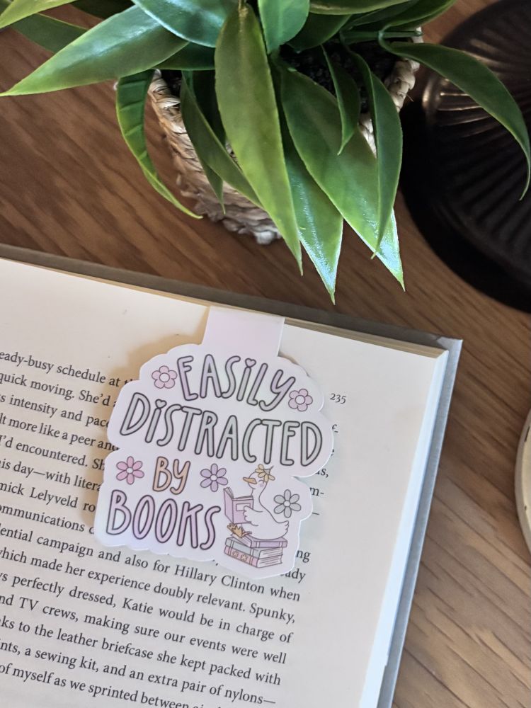 A fun and bookish handmade magnetic bookmark featuring the phrase "Easily Distracted by Books" with a cute illustrated duck reading on a stack of books. A perfect gift for book lovers, teachers or anyone who happily gets lost in a good story.
