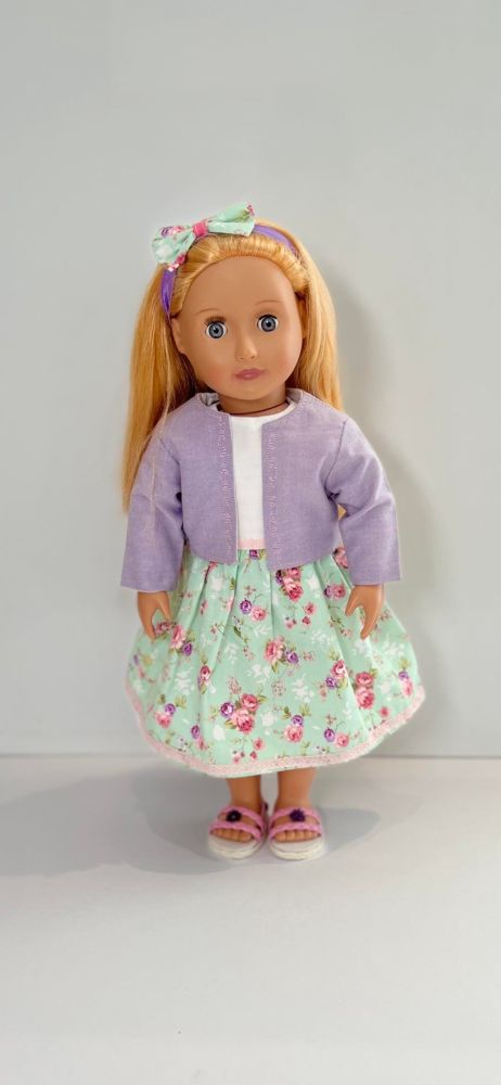 This set includes a sleeveless mint ditsy floral dress, a lilac blazer with embroidery detail in front, a bow hair elastic hairband and handmade sandals.