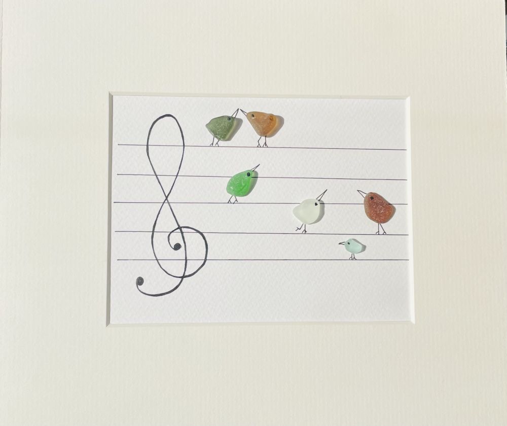 Musical birds sea glass art! Sea glass was hand picked  from the beaches and rocks of Sandycove Co Dublin. Each piece is unique and handmade locally. Frames with glass fronts panel are sourced from Wicklow. Free postage in Ireland . Give a sustainable handmade Irish gift!