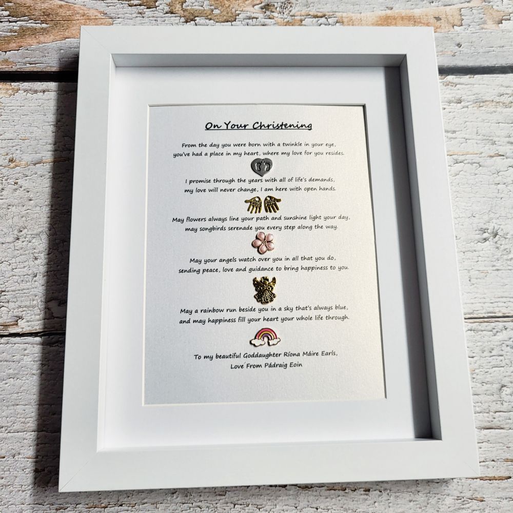 Beautiful personalised framed print makes the perfect gift for a boy or a girl on their Christening / Naming Day. This frame is a lasting memento that can be treasured for years to come. It's not just a christening gift, but a piece of decor that serves as a constant reminder of this special day.