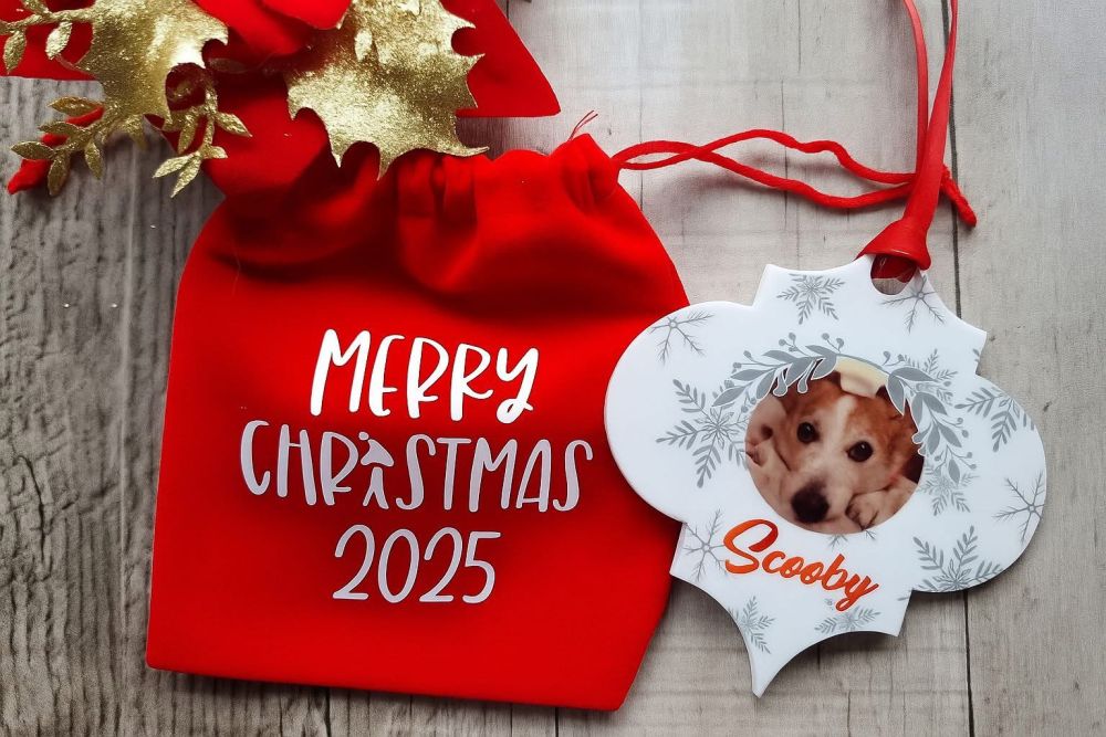 A beautiful festive bauble gift personalised with with your favourite photo, printed on acrylic and finished in festive ribbon in a red velvet year stamped draw string pouch. A beautiful gift idea for the family and the animal lover.