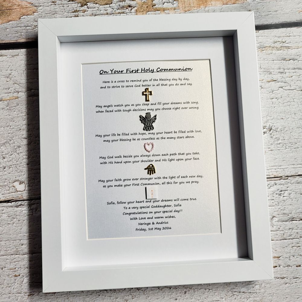 Celebrate the sacred occasion of a First Holy Communion with this beautiful Holy Communion Frame. This personalised keepsake is a perfect way to commemorate this significant event in a child's spiritual journey.
