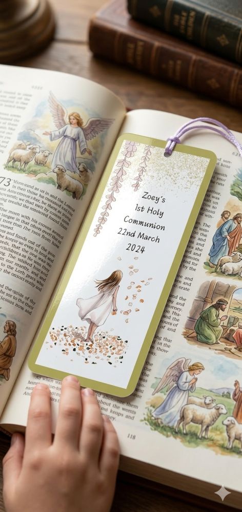 Celebrate special faith milestones with our personalised bookmarks, perfect for First Communion and Confirmation gifts. Each bookmark is beautifully printed on high gloss photo paper, ensuring vibrant, lasting colors, and laminated on both sides for added durability. Measuring approximately 5.5 x 15-17.5 cm, sizes vary slightly by design. Available with assorted colorful tassels, these bookmarks make meaningful keepsakes or favours for religious events. Bulk options are offered, ideal for Communion and Confirmation celebrations, church groups, or gift giveaways.