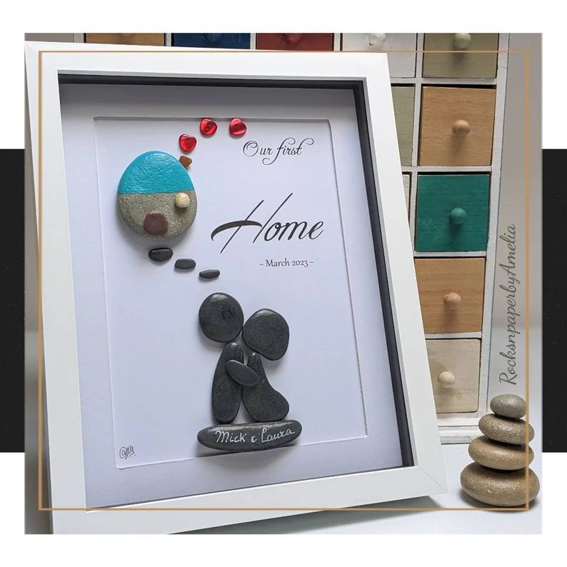 This personalised picture makes a very special and unique gift for a couple getting engaged and/ or moving into a new house. Comes on a frame measuring approximately 9×11″, available in white or grey.