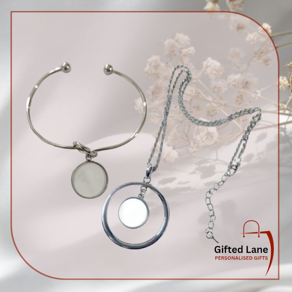 Personalised Round Pendant Chain & Bracelet Jewellery Set is a unique personalised gift accessory for a occasion or a keepsake of a special day. It is a silver chain & bracelet set each with a round pendant charm which can be personalised with a picture and with a date or name on it. Another special personalised gift from Gifted Lane