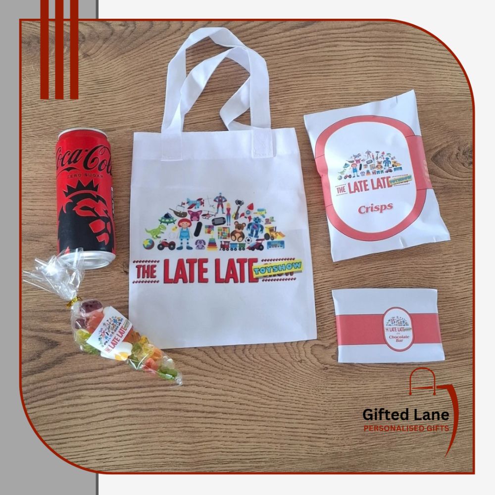 Enjoy the Toy Show with a Personalised Toy Show Treat bag. Each bag can be personalised with a name and contains a candy cone of either drinking chocolate and marshmallows, jelly sweets or popcorn, a drink of either Fruit Shoot or Can of Mineral or Water, packet of chrisp, bar of chocolate and other sweets available at the time. Another special personalised gift from Gifted Lane. Check out our store today and see, like, comment and review on our full range of personalised gifts from Gifted Lane. Remember a personalised gift from Gifted Lane is always a special gift.
