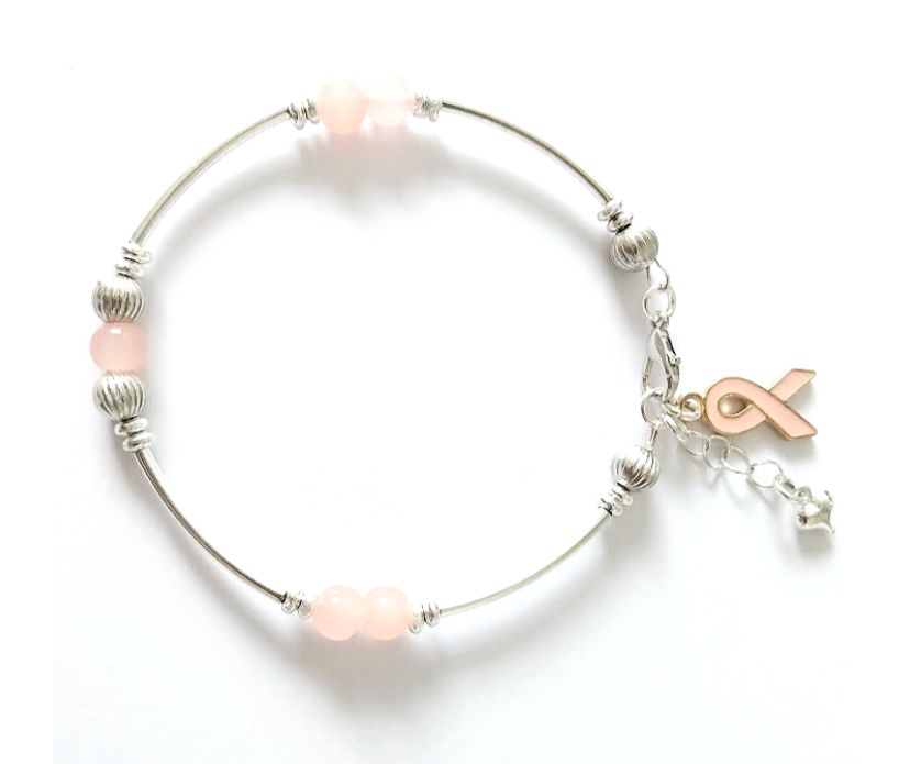 Gorgeous handmade silver plated bracelet, created with light salmon pink translucent glass beads, an enamelled ribbon charm in light salmon pink, and an extension chain, finished with a tiny silver plated heart charm. A lovely bespoke piece, light weight and easy to wear…. It arrives in a pretty organza bag, and has free shipping.