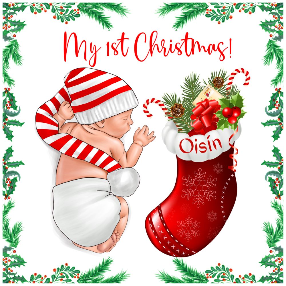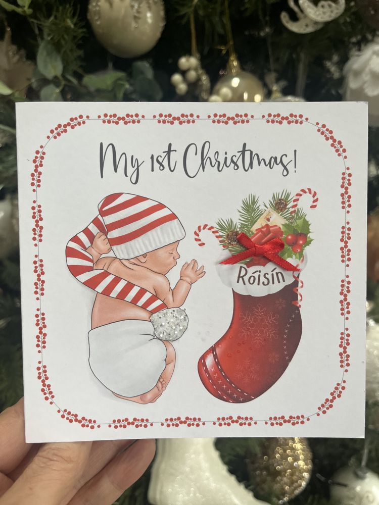 Celebrate the magic of a little one’s very first Christmas with this beautifully designed card, featuring a newborn snuggled in a long knitted hat and a festive stocking filled with holiday treasures. Perfect for gifting to family and friends or adding to a keepsake collection, this card captures the wonder and warmth of the season’s most precious moments.
