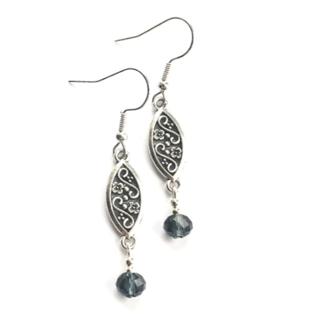 Handmade, antique silver filigree earrings, created with beautiful faceted glass beads in a deep navy, and silver plated beads and ear wires. The ear wires are nickel free and suitable for sensitive ears. These gorgeous sparkly earrings are light and easy to wear. Elevate your style with these lovely bespoke pieces. They arrive in a pretty organza bag, and have free shipping.