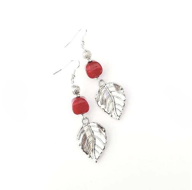 Handmade earrings, created with polished antique silver leaf drops, acrylic beads in a beautiful deep red, silver plated beads and ear wires. The ear wires are nickel free and suitable for sensitive ears. The drop on these earrings is approx. 5cm/2ins. Gorgeous, lightweight and comfortable to wear. Stand out and elevate your style with these bespoke beauties! They arrive in a pretty organza bag, and have free shipping!