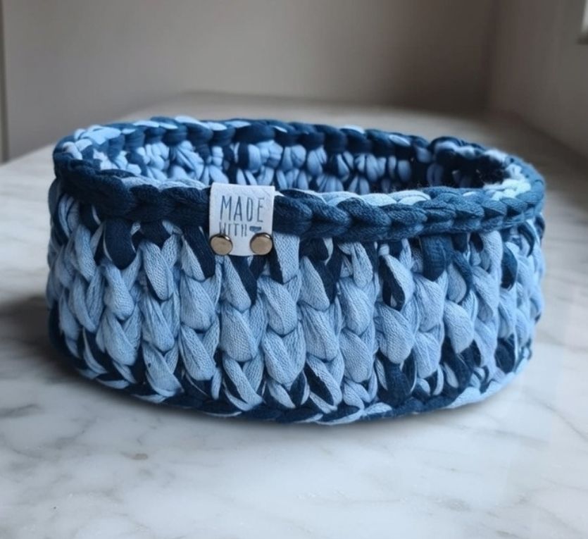 Add a touch of calm coastal charm to your home with this beautifully hand-crocheted oval basket. Crafted with love from soft, upcycled ribbon yarn, it blends shades of deep navy blue and lighter sky blue for a subtle ombre effect that's both modern and timeless.
