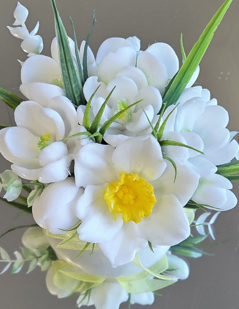 Snowdrops and dafodil from soap nicely arranged in a white handmade pot