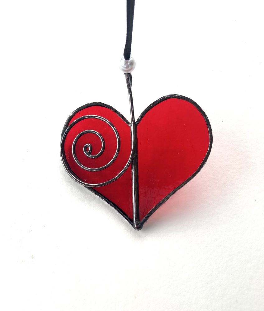 Stained glass red heart with wire spiral. A beautiful piece to send to someone special. The piece is 6.5cm high and 7cm wide and comes in a presentation box. There will be variations in the glass colour.