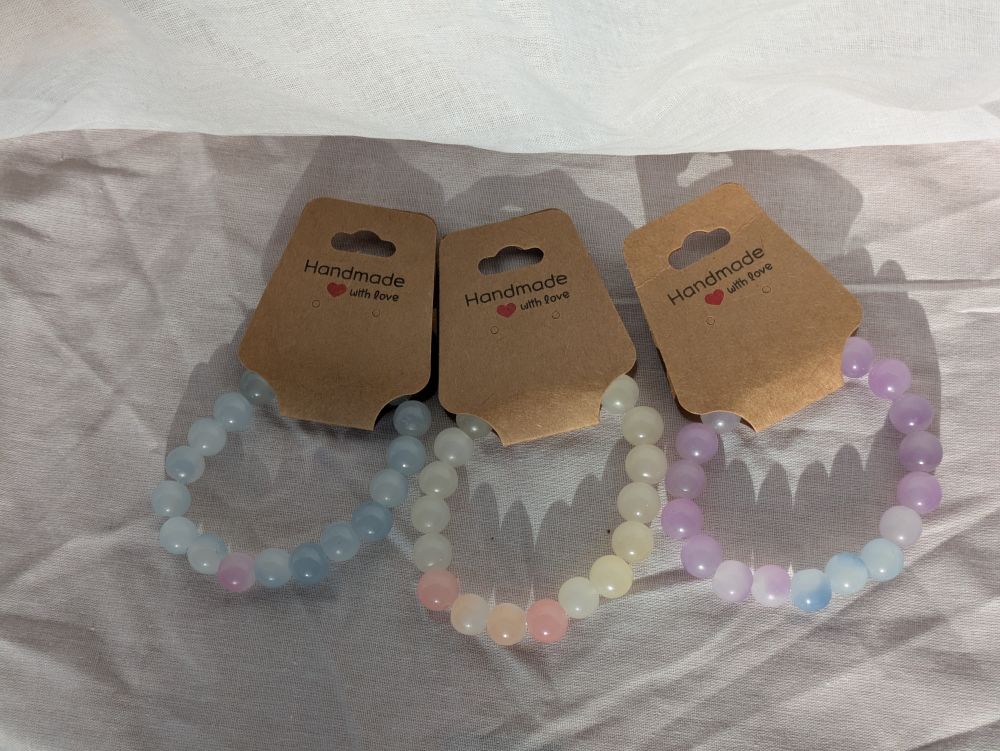 A cute UV Bracelet made with elastic string. It changes from a white colour to either blue, purple, red, yellow and Orange ( depending on the bracelet selected) when in contact with Sunlight or UV.